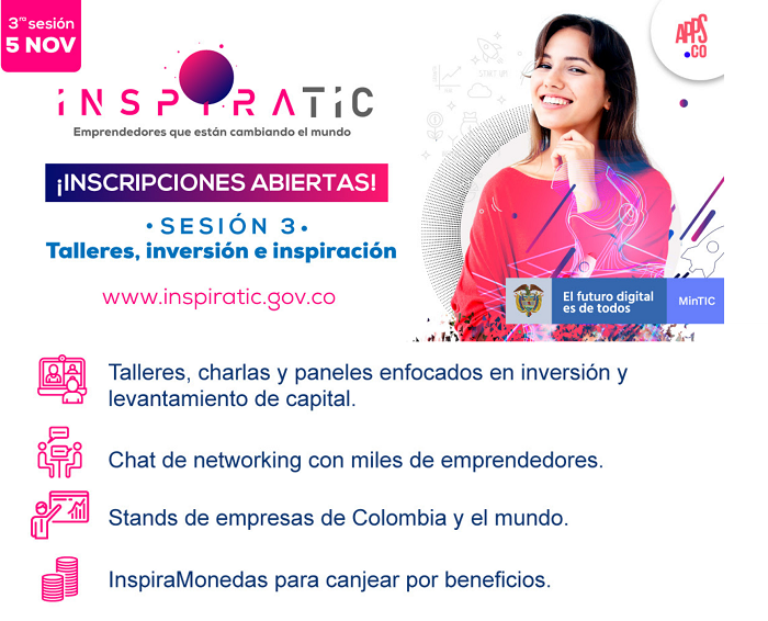 amigo empresario estas leyendo bien, las inscripciones están abiertas! 👉el Ministerio TIC te invita a participar de la tercera sesión de #InspiraTic ¡Aprovecha y regístrate gratis! ➡️ https://eventos.inspiratic.gov.co/registro-usuarios/ODc=