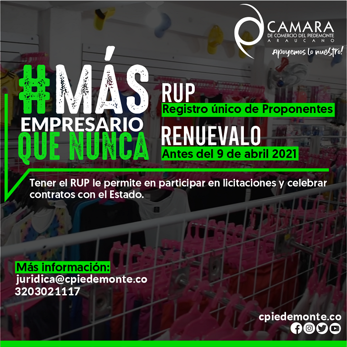 Participa en licitaciones y contrata con el Estado, lleva tus productos a nuevos mercados y sigue creciendo. Renueva tu #RegistroUnicoDeProponentes. Fecha límite 9 de abril,  hazlo fácil en: cpiedemonte.co