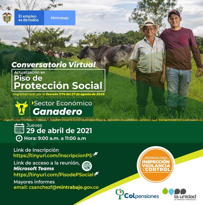 Si usted hace parte de las organizaciones gremiales ganaderas, el Ministerio de Trabajo y su Dirección de Inspección, Vigilancia y Control y Gestión Territorial, lo invita a participar en el conversatorio sobre «Actualización en puso de protección social» con el fin de resolver las inquietudes que tengan los empleadores, organizaciones sindicales y trabajadores del sector.